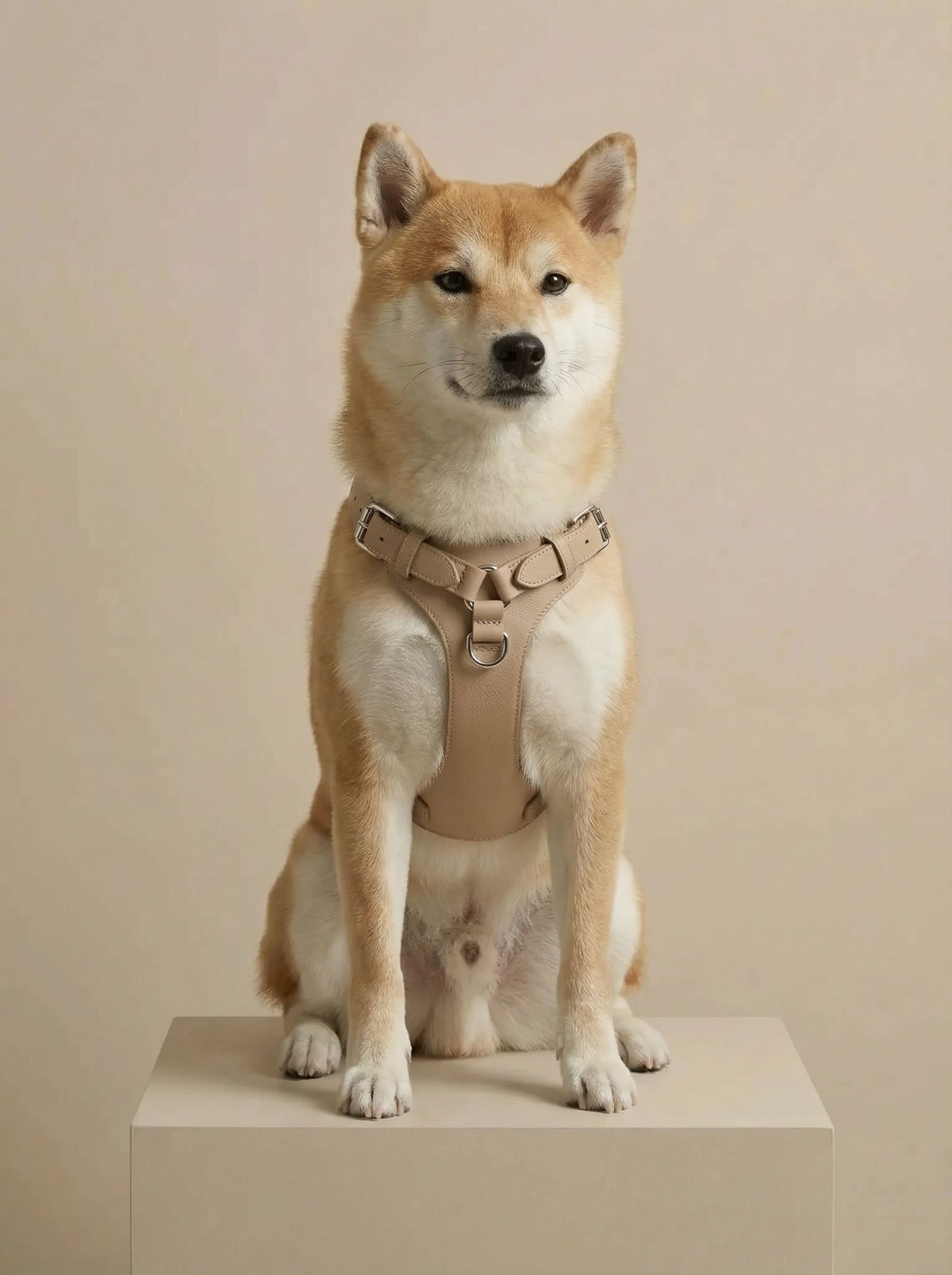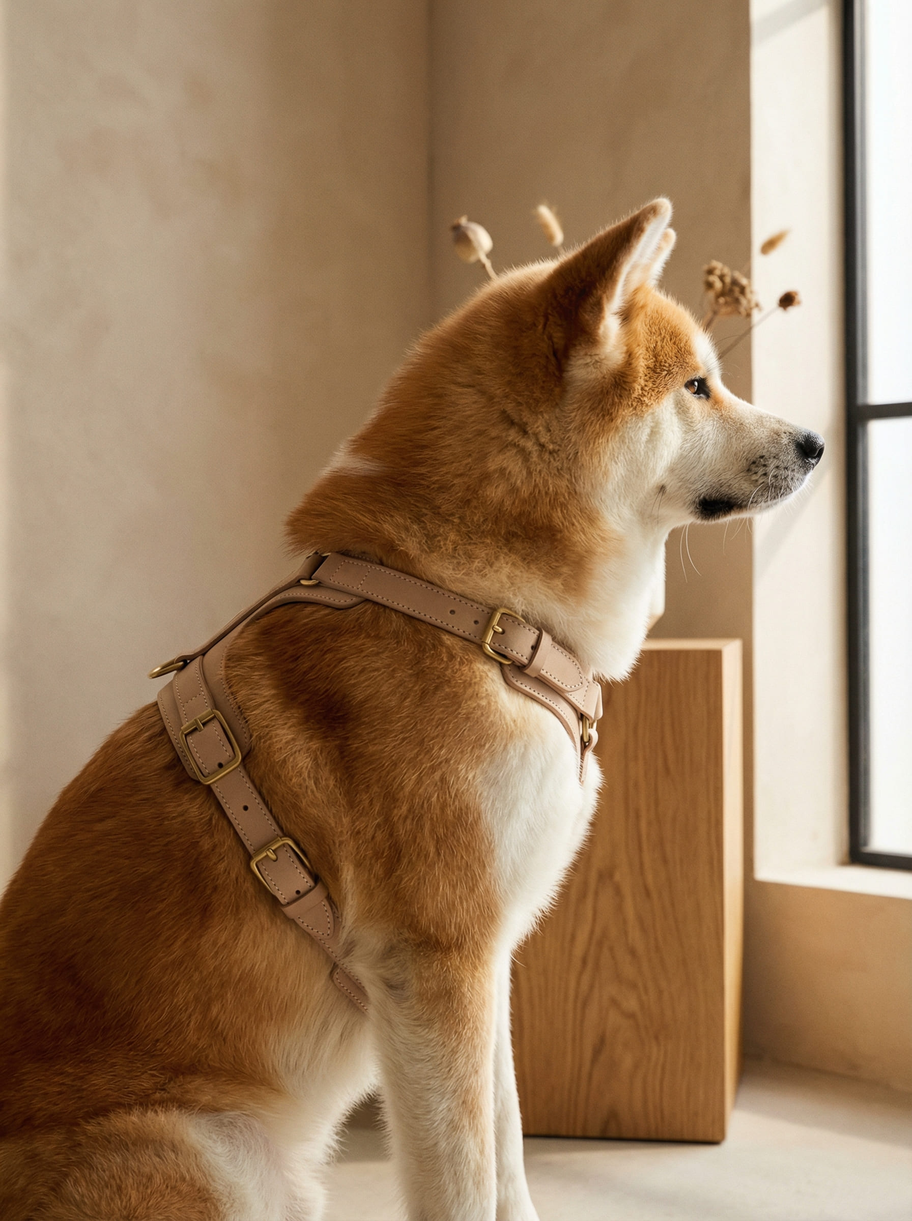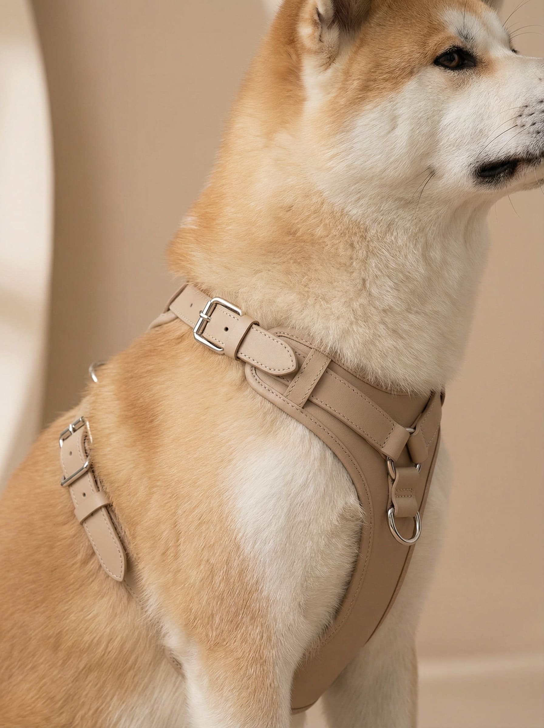 毛並みに寄り添う柔らかなカーブ、光を受けたときに現れる陰影、バックルの機能美、そして自然の中にそっと溶け込むニュートラルカラー。“素材そのものの静かな美しさ”と“犬が身に着けた瞬間の気品”が伝わるよう、すべてのビジュアルにおいてレザーの触感と立体感を丁寧に設計しました。